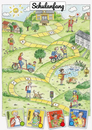 Mit dem Ende der großen Ferien beginnt ein neues Schuljahr. Für viele Kinder ist es der allererste Schultag und die älteren Jahrgänge freuen sich auf das Wiedersehen mit ihren Schulfreunden. Um dieses Ereignis spielerisch zu begleiten, hat sich die Künstlerin Anna Zeis-Ziegler für Pfarrbriefservice.de etwas besonderes ausgedacht: Ein von Hand illustriertes Brettspiel zum Thema Schulanfang.
