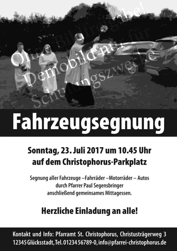 Für die Bewerbung einer Fahrzeugsegnung durch den Ortsgeistlichen sollen Plakate erstellt werden. Die erste Bildidee dazu: ein Priester beim Durchschreiten von Fahrzeugreihen, am besten mit erhobenem Weihwasserwedel. Was auf den ersten Blick naheliegend erscheint, erweist sich bei näherer Betrachtung nicht nur schnell als langweilig, sondern auch als schwierig in der Umsetzung.