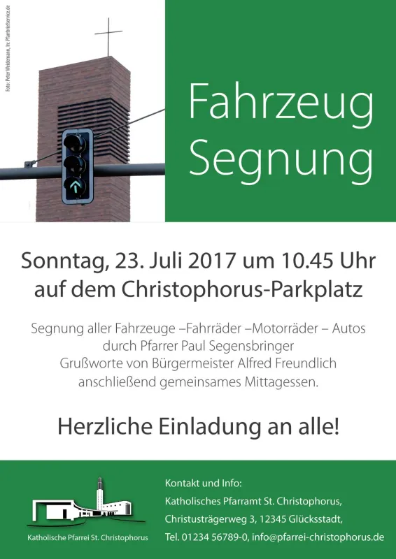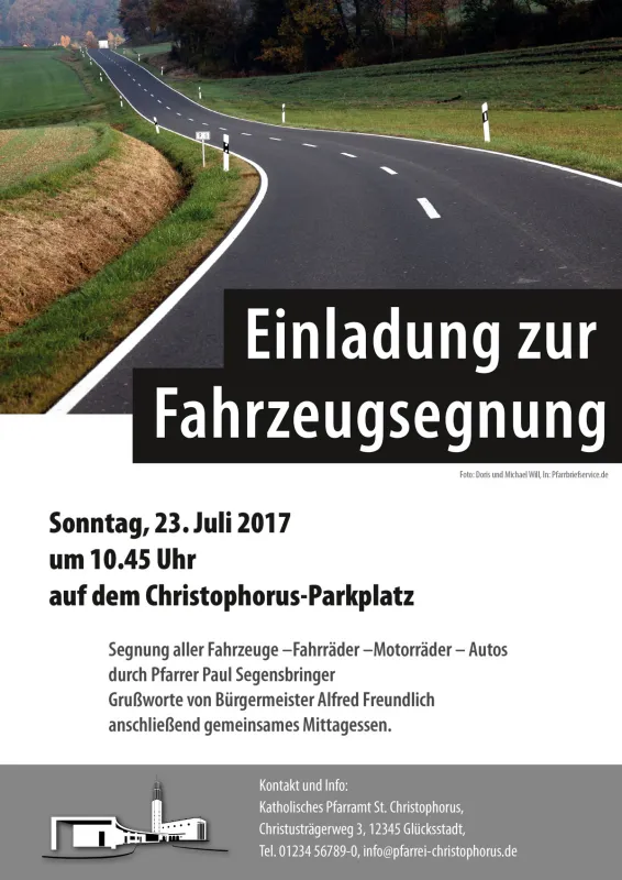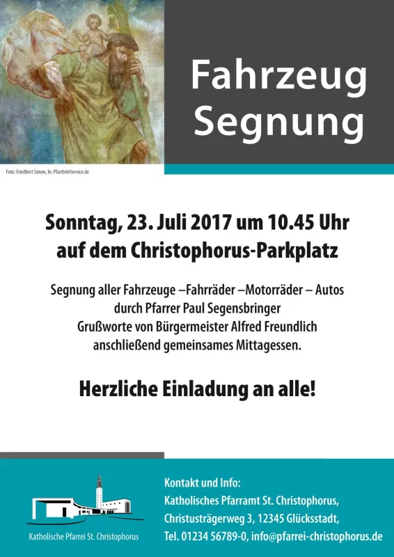 Beispiel 3: Segnung von Fahrzeugen – es geht um „unterwegs sein“, „auf Reisen sein“ – Schutzpatron der Reisenden ist der Hl. Christophorus. Eine Suche bei Pfarrbriefservice zum Stichwort „Christophorus“ erbringt tatsächlich ein paar brauchbare Bilder des Schutzheiligen. Das obige Beispiel zeigt, wie eines dieser Bilder in den Kontext „Fahrzeugsegnung“ gesetzt werden kann.