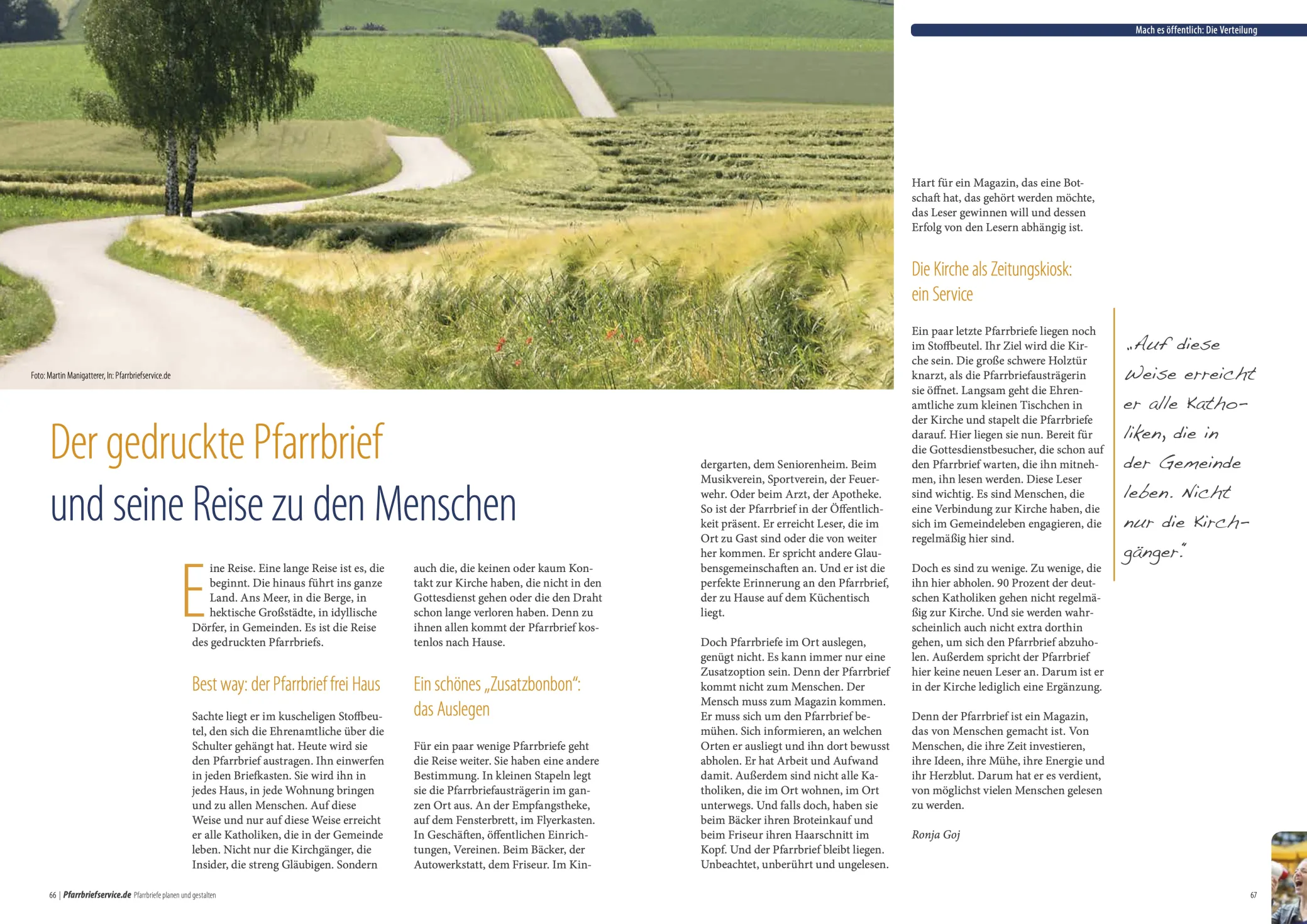 Es kostet so gut wie nichts, einige Hefte mehr zu drucken, um sie an diesen Stellen zu platzieren. Der Image-Vorteil ist aber enorm. Der Pfarrbrief mischt sich selbst unters Volk und demonstriert vor allem durch seine Präsenz in den Geschäften und in der Verwaltung, dass die Kirchengemeinde kein Ghetto-Dasein fristet. Die einfache Botschaft lautet: Unsere Gemeinde steht mitten im Leben.