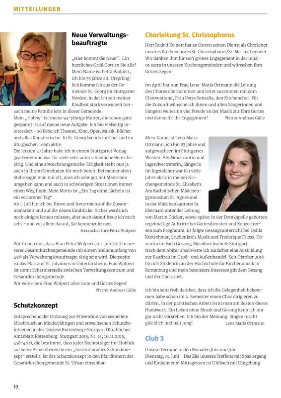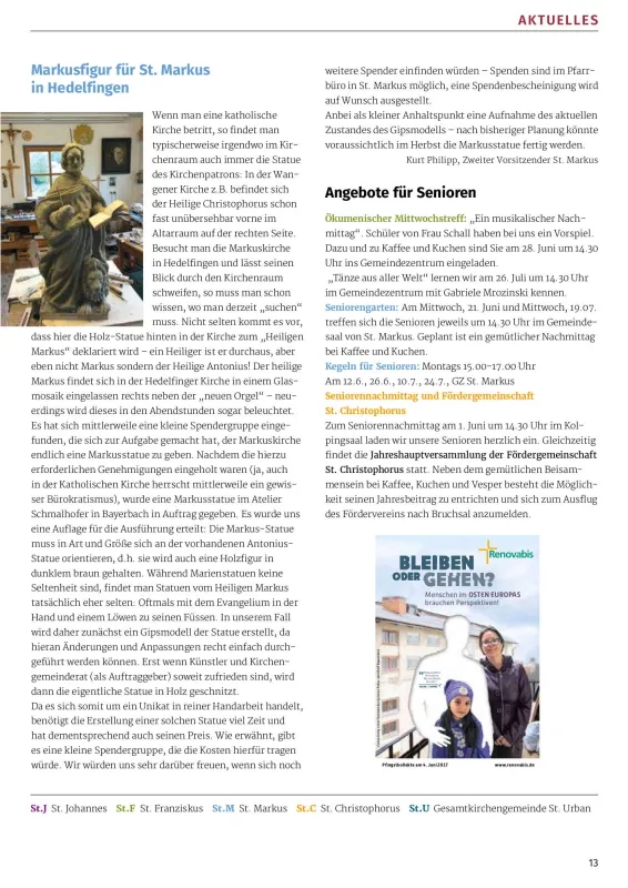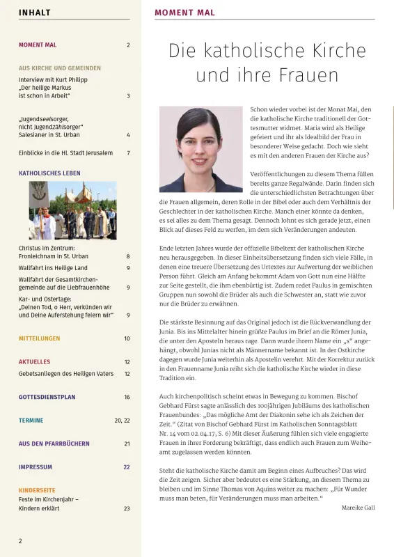 Dieses Magazin bietet auch weiterhin einen umfangreichen und natürlich nach wie vor wichtigen Pflichtteil mit übersichtlicher Gottesdienstordnung, Terminhinweisen, Überblick über die Nachrichten aus den Pfarrbüchern und den aktuellen Mitteilungen aus den einzelnen Gemeinden. Dazu kommt aber jetzt die Kür. Das sind die Beiträge, die eben auch in einen guten Pfarrbrief gehören, die zum Lesen und Nachdenken einladen, die einzelne Menschen oder Gruppen aus den Gemeinden portraitieren. „St. Urban im Fokus“ ist kein „Durchblätter-Produkt“ mehr. In den 24 Seiten verweilt der Leser gerne und vertieft sich in die Lektüre.