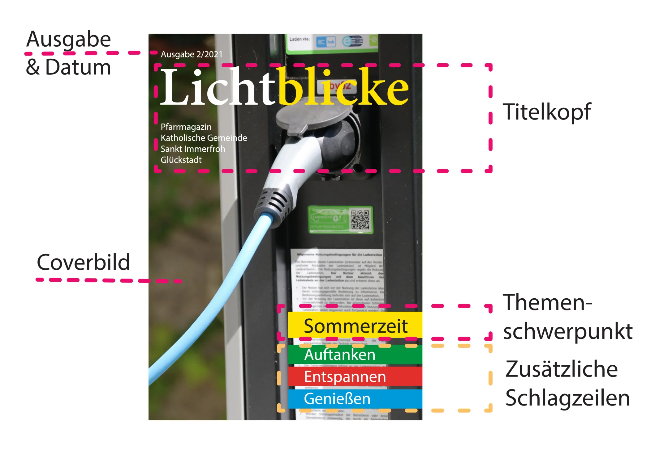 Ein gelungenes Cover-Design zeichnet sich aus durch die harmonische Verbindung von Titelkopf, Ausgabe und Datum, einem aussagekräftigen Titelbild, einem deutlich hervorgehobenen Themenschwerpunkt oder Leitartikel sowie prägnanten zusätzlichen Schlagzeilen. Damit gelingt es, die Aufmerksamkeit der Leserschaft zu wecken und zum Lesen des gesamten Magazins oder Pfarrbriefs anzuregen.