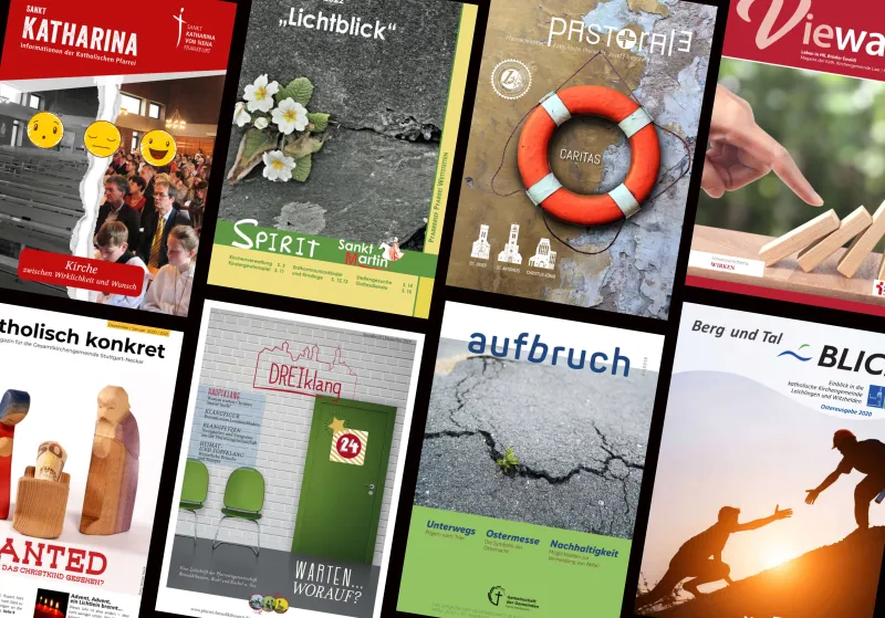 Verschiedene Titelseiten von echten Pfarrbriefen und Pfarrmagazinen.
