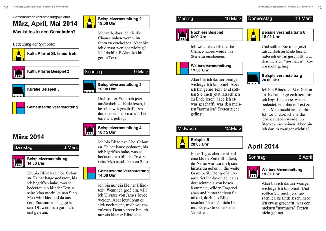 Für gute Übersichtlichkeit der Termine aus den beteiligten Pfarreien sorgen in diesem Beispiel die verschiedenen Farben und Symbole. Diese werden eingangs mittels einer Legende erläutert. Der Terminkalender ist aufgrund seiner tageweisen Gliederung sehr ausführlich, mit entsprechendem Platzbedarf. Er eignet sich u.a. für Pfarrbriefe, die einen Teil ihres redaktionellen Schwerpunkts in der regelmäßigen Ankündigung von Veranstaltungen sehen. Sicherlich ist diese Form auch interessant für Blätter, die es auf mindestens 12 Ausgaben im Jahr bringen und die Veranstaltungen aus mehreren beteiligten Gemeinden abbilden möchten.