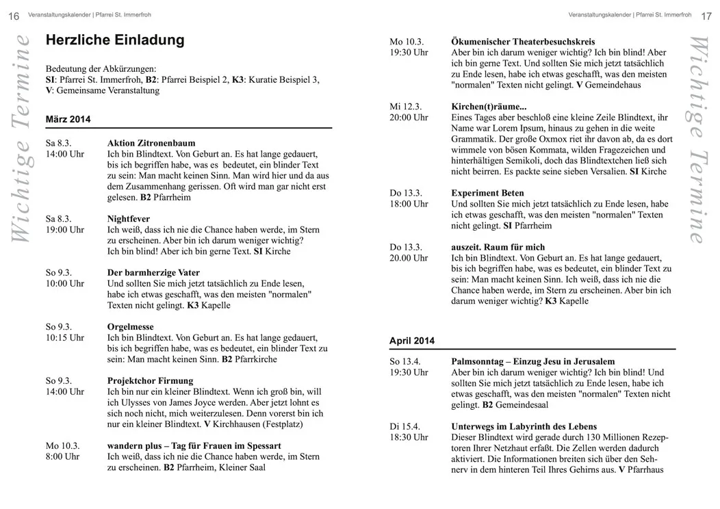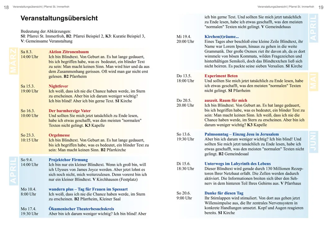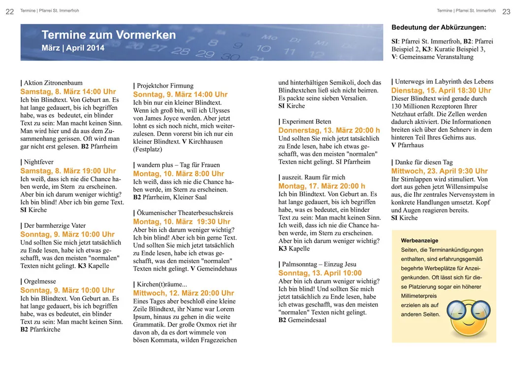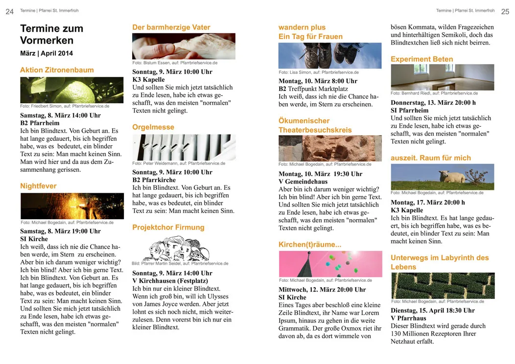 Termine, Veranstaltungen und Ankündigungen haben meist ihren festen Platz im Pfarrbrief. Pfarrbriefredaktionen präsentieren diese praktischerweise oft gebündelt auf einer oder mehreren aufeinanderfolgenden Seiten. Doch wie setzt/gestaltet man eine große Zahl unterschiedlicher Termine, ohne dass die Übersicht darunter leidet?