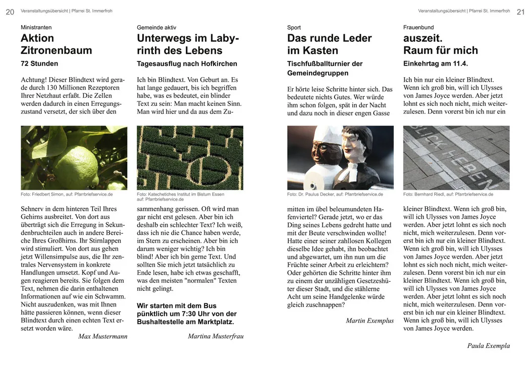 Bunt bebildert und dennoch platzsparend präsentiert diese Beispielseite Kurzankündigungen und Termine. Die Aneinanderreihung der Nachrichten erfolgt chronologisch, kommt ohne Mengenvorgaben aus und ist daher sehr flexibel. Die Bilder erscheinen durchgehend in derselben Größe, was zur Ruhe des Satzbildes beiträgt. Für mehrere beteiligte Pfarreien wird wieder mit Abkürzungen gearbeitet. Eine entsprechende Legende fehlt auf dieser Doppelseite, kann aber auf der letzten Termine-Seite oder auch im Impressum erscheinen.