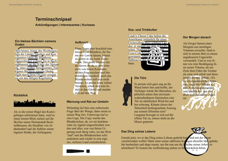 Locker aneinandergereiht und mit einfachen Grafiken hinterlegt sind die Termine und Ankündigungen in diesem Beispiel. Der Satzspiegel wurde gestalterisch bewusst durchbrochen, womöglich um zu unterstreichen, dass es sich um unverbindliche Angebote handelt, an denen man teilnehmen kann, aber nicht muss. Es ergibt sich eine attraktive Gesamtoptik, die Leser einlädt, näher hinzuschauen.