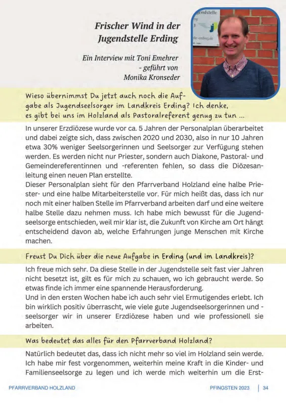 Bild 2: Pastoralreferent Emehrer hat in seinem Impuls zu Pfingsten von seiner neuen Aufgabe in der Jugendstelle Erding geschrieben. Da bietet es sich an – und wird in diesem Fall auch prima genutzt! -, diese Aufgabe und ihre Auswirkungen auf den Pfarrverband näher vorzustellen. Die Interview-Form ist ideal für diesen Beitrag. Im Gespräch geht es um Fragen, die einige Leserinnen und Leser bestimmt auch haben. Und diese Textgattung bietet Abwechslung zur übrigen Lektüre und setzt damit einen Akzent für mehr Leseanreiz.