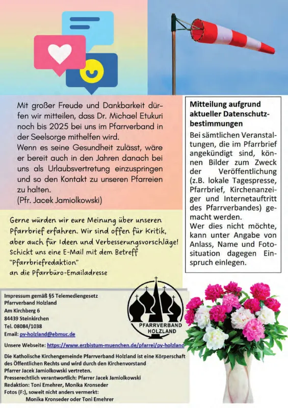 - Kontakt zur Redaktion: Pfarrverband Holzland, Am Kirchberg 6, 84439 Steinkirchen, E-Mail: pv-holzland@ebmuc.de