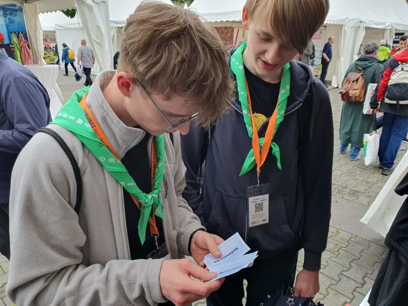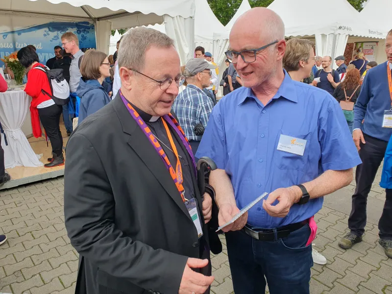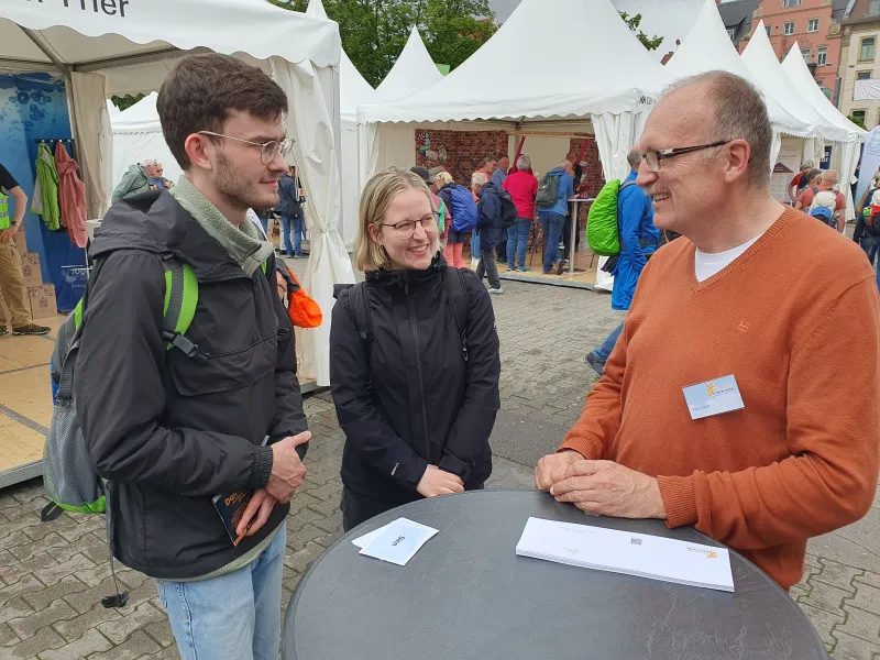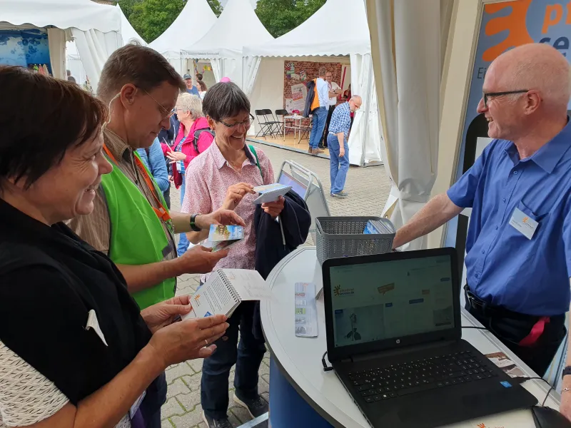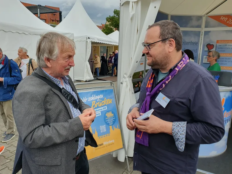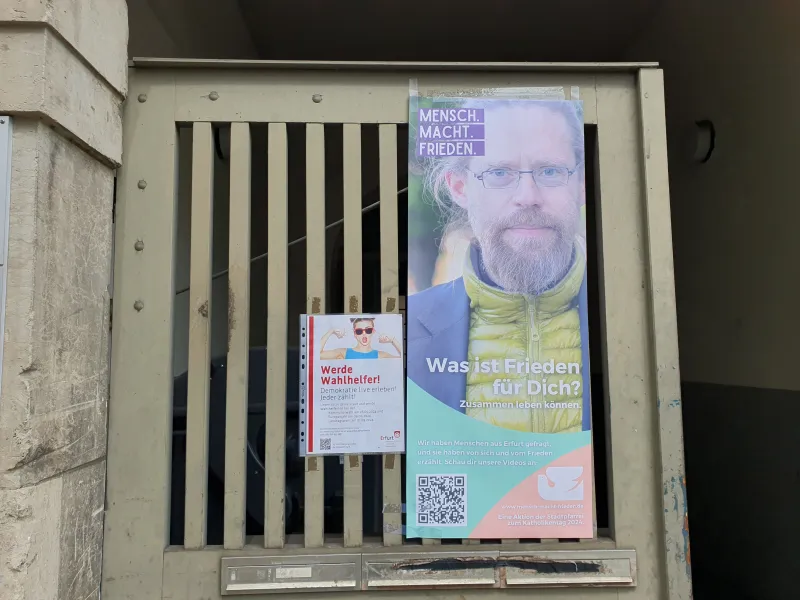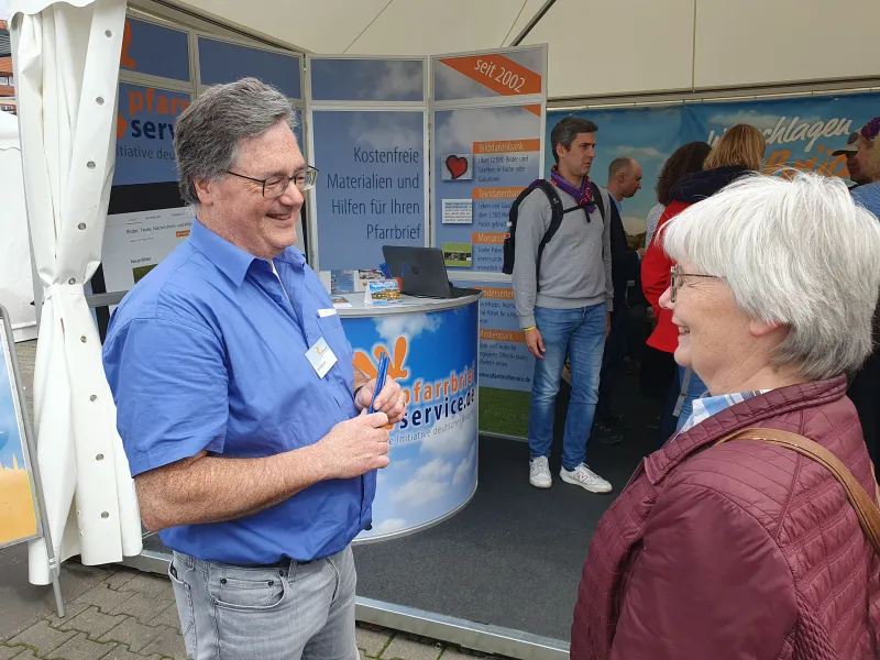 Vielfältige Eindrücke bleiben vom Katholikentag 2024 in der thüringischen Landeshauptstadt Erfurt: eine wunderschöne, gastfreundliche und verkehrsberuhigte Innenstadt, Sonne trotz Unwetterprognosen, viele Gespräche am Stand über die Öffentlichkeitsarbeit, aber auch über Politik, die Wiedervereinigung und den Zustand unserer Gesellschaft. Wir danken für die vielen guten Begegnungen, dafür, dass uns Menschen etwas von ihrer Arbeit und ihrem Leben erzählt haben und dass sie uns in unserer Arbeit mit ihrem positiven Feedback bestärkt haben. Ganz besonders gefreut hat es uns, dass wir vielen Menschen mit unserem Katholikentagskalender eine große Freude machen konnten. Er begleitet die Menschen von Juni 2024 bis zum nächsten Katholikentag in Würzburg im Mai 2026 mit Bildern und Texten unserer Pfarrbriefservice.de-Autorinnen und -Autoren. Viele Menschen kamen deswegen zu uns an den Stand. Auch diesmal wieder mit dabei: Peter Schott mit seiner Textaktion. Es ist immer wieder berührend zu sehen, wie er für die Menschen, die vor ihm stehen, die richtigen Worte findet und für sie aufschreibt. Sie finden seine Wunschtexte vom Katholikentag hier.