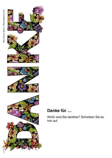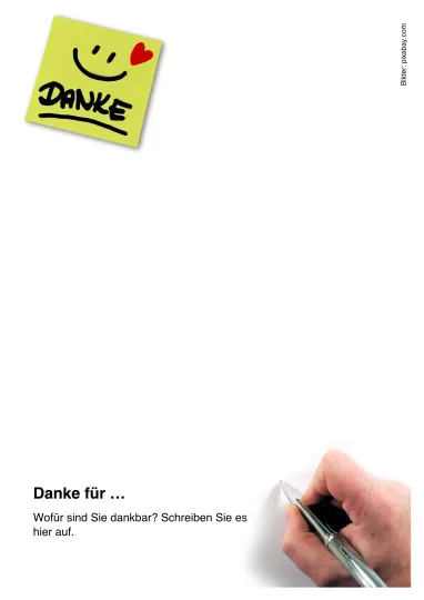 Ermuntern Sie Ihre Leserinnen und Leser, gleich mit dem Danken anzufangen. Bieten Sie ihnen eine ansprechend gestaltete Seite im Pfarrbrief, auf der Ihre Leserinnen und Leser ihren Dank für Schönes in ihrem Leben aufschreiben können. Hier und hier finden Sie zwei Vorlagen, die Sie gleich verwenden können.