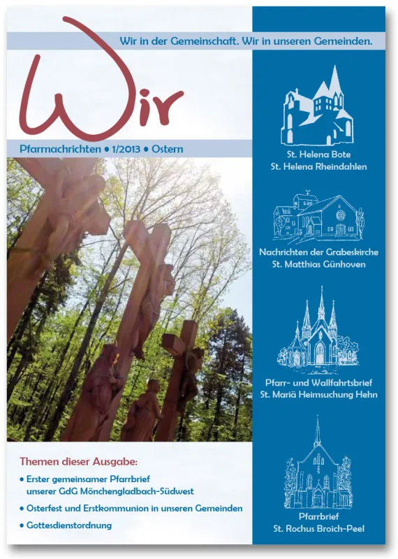 Ein klarer Blau- und ein dynamischer Rotton dominieren die Titelseite der Pfarrnachrichten „Wir“, die alle zwei Monate im Südwesten Mönchengladbachs erscheinen.