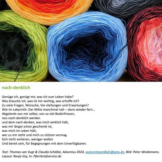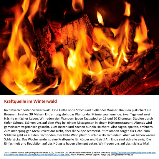 Die Text-Bild-Impulse finden Sie im unteren Bereich dieser Nachricht zum Download. Sowohl mit, als auch ohne Banderole. Denn Sie können die Impulse auch losgelöst von der Advents- und Weihnachtszeit verwenden. Beispielsweise unter dem Jahr als meditative Impulse oder als Suffizienz-Impulse.