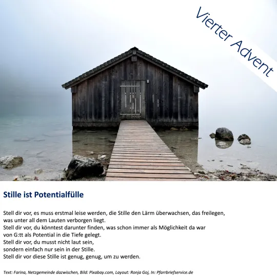 Dazu möchte Pfarrbriefservice.de einladen, animieren, ermutigen. Hat passende Texte und Bilder der eigenen Autoren ausgewählt und zu Text-Bild-Impulsen zusammengesetzt. Vier Impulse erstellt. Für jeden Adventssonntag einen.