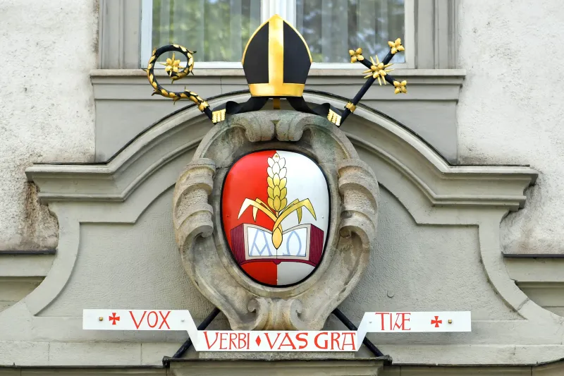 Das Wappen von Bischof Bertram Meier ziert das Augsburger Bischofshaus. (Foto: Nicolas Schnall/pba)