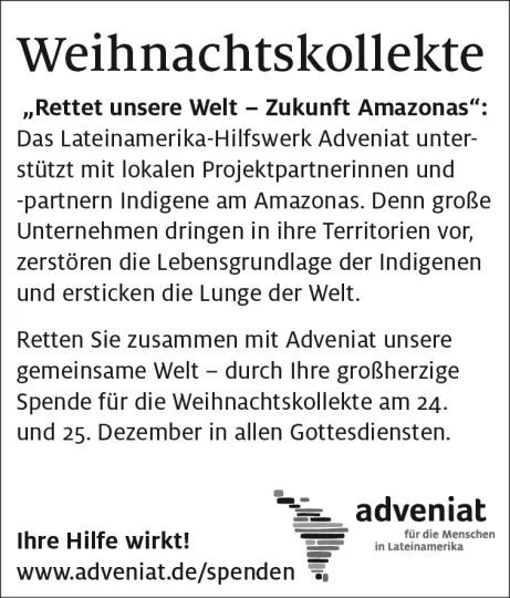 Adveniat, das Lateinamerika-Hilfswerk der katholischen Kirche in Deutschland, steht für kirchliches Engagement an den Rändern der Gesellschaft und an der Seite der Armen. Getragen wird das Werk von hunderttausenden Spenderinnen und Spendern – vor allem auch in der alljährlichen Weihnachtskollekte am 24. und 25. Dezember. Die Hilfe wirkt: Im vergangenen Jahr konnten rund 2.500 Projekte gefördert werden, die mit 40 Millionen Euro genau dort ansetzen, wo die Hilfe am meisten benötigt wird: an der Basis, direkt bei den Armen. Weitere Informationen: www.adveniat.de