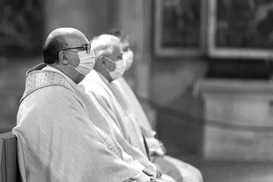 Corona: Priester mit Schutzmaske im Gottesdienst [auch sw]