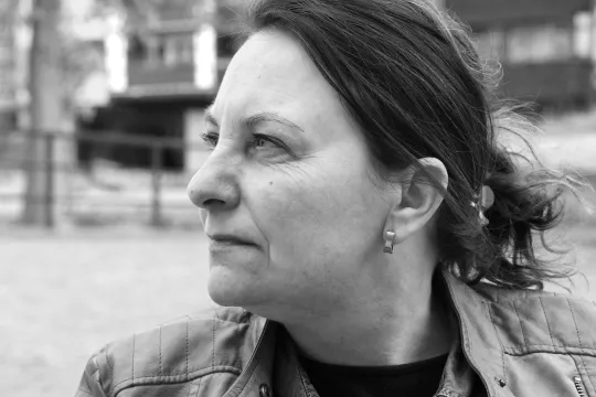 Frau mit braunen Haaren blickt nach links, Hintergrund unscharf mit Gebäuden.
