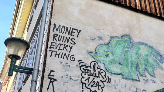 Weiße Schrift auf Asphalt: „WE CAN NOT EAT MONEY“