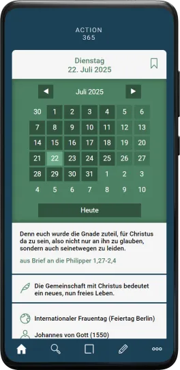 Die Tagesansicht der App action 365 bietet den Bibelvers für den Tag, einen kurzen Kommentar, den Verweis auf den Tagesheiligen und Raum für eigene Notizen.